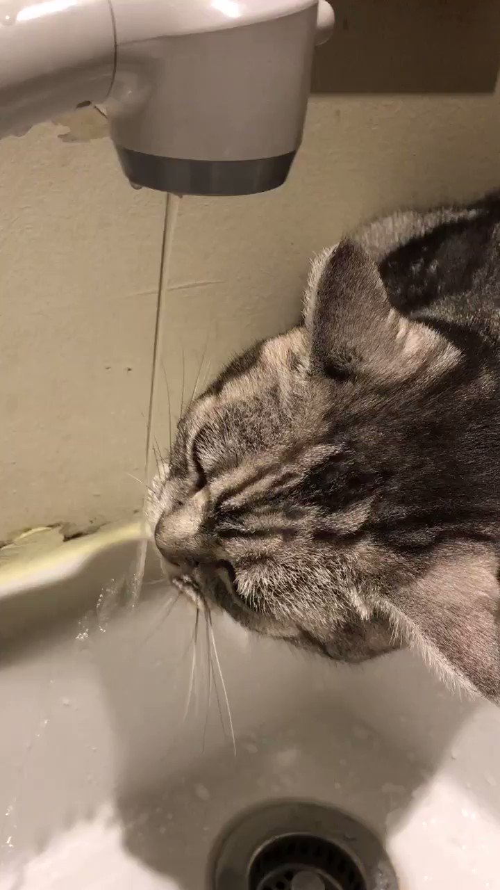 水道から出た水の軌道を変えてコップの水を飲む猫のミーちゃん。